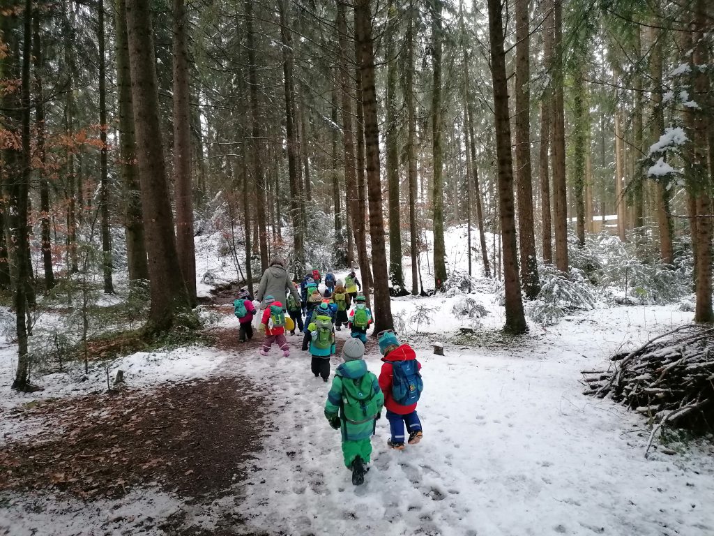 Unser Waldkindergarten „Die Buntspechte“ ist ein Kindergarten ohne Wände und bietet Platz für 20 Kinder im Alter von 3- 6 Jahren. Die Buntspechte treffen sich jeden Morgen im Garten der Kindertagesstätte, um gemeinsam zu ihrem Waldplatz zum gemeinsamen Toben, Spielen, Bauen und Entdecken zu gehen. Der Waldkindergarten befindet sich auf einer kleinen Anhöhe zwischen einem kleinen Bach und einer Wiese. „Die Buntspechte“ haben einen beheizbaren Bauwagen für den Fall, dass extreme Witterungsbedingungen einen längerfristigen Aufenthalt im Freien verhindern. Außerdem dient der Bauwagen als Ort für Angebote und als Aufenthalts- und Rückzugsraum für die Kinder. Zudem gibt es bei den „Buntspechten“ ein „Tarp“ (Zeltplane), mehrere Sitzkreise sowie eine Werkbank, ein Kräuterbeet und zahlreiche Spielmöglichkeiten in der Natur. Gespielt wird mit dem, was sich in Wald und Wiese findet, vom Baumstamm bis Blättern, Früchten, Gräsern, Moos und Steinen. Selbstverständlich steht eine ganzheitliche Förderung der Kinder im Vordergrund: ein Lernen mit allen Sinnen, die Förderung der Motorik, gestalterische sowie naturwissenschaftliche Kompetenzen sowie die Stärkung sozialer und intrapersoneller Fähigkeiten.